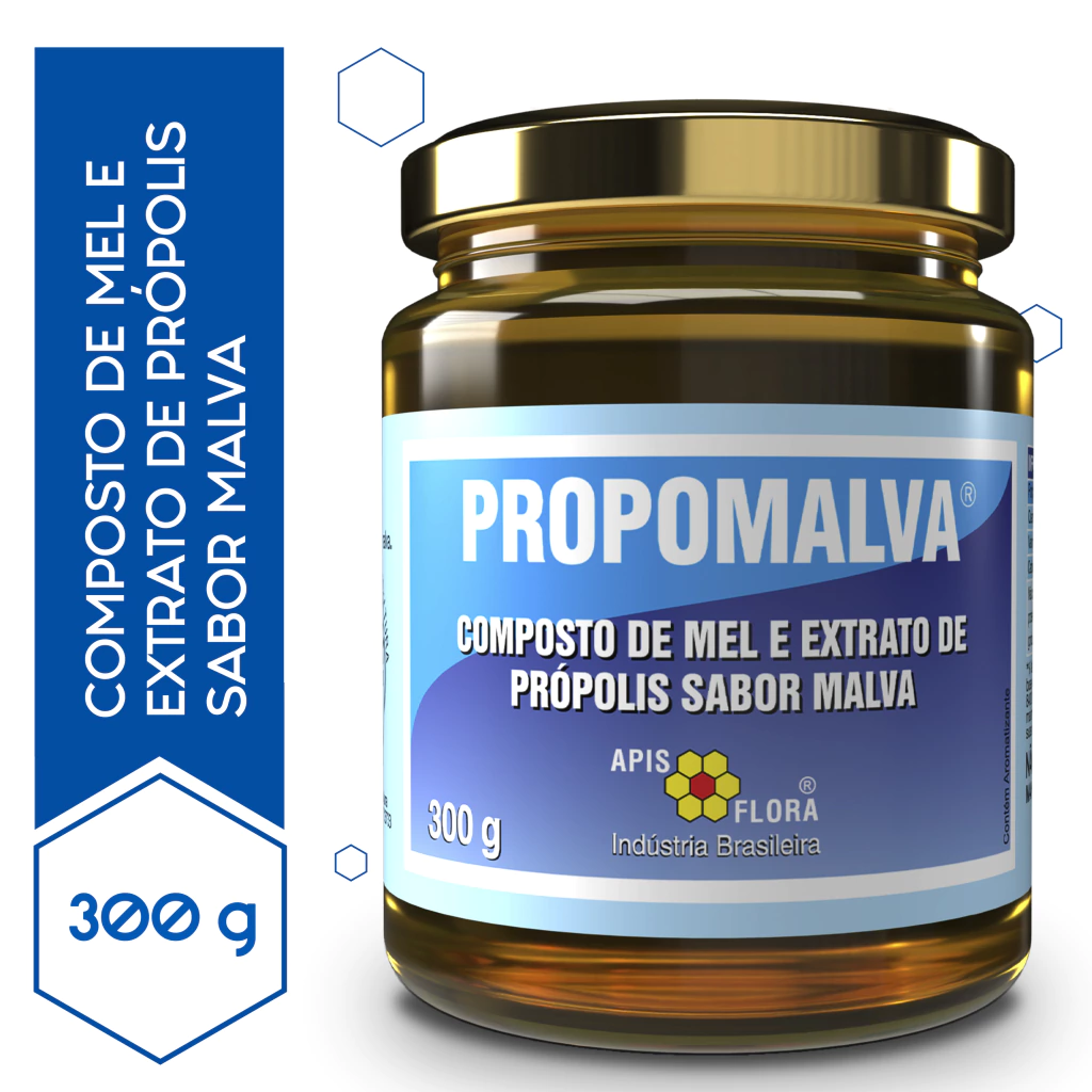 DESCRIÇÃO Do Produto O Propomalva® é um composto de mel polifloral, extrato de própolis e extrato de malva (Malva sylvestris). Apresenta sabor forte e marcante. MODO DE USO: Uma colher de sopa, de uma a quatro vezes ao dia. LISTA DE Ingredientes Mel, extrato de própolis e aroma de malva. INFORMAÇÕES IMPORTANTES Este produto não deve ser consumido por crianças menores de um ano de idade Não contém glúten Manter em local fresco A Malva A malva-cheirosa (Malva sylvestris) é uma planta herbácea com importantes propriedades curativas que pertence à família Malvaceae. Na Europa ela pode ser encontrada nos prados e nas bordas dos campos cultivados. No Brasil esta é uma espécie que precisa ser plantada, ou por sementes, ou por mudas. A planta é conhecida por suas propriedades emoliente, suavizante e anti-inflamatória das membranas e mucosas.